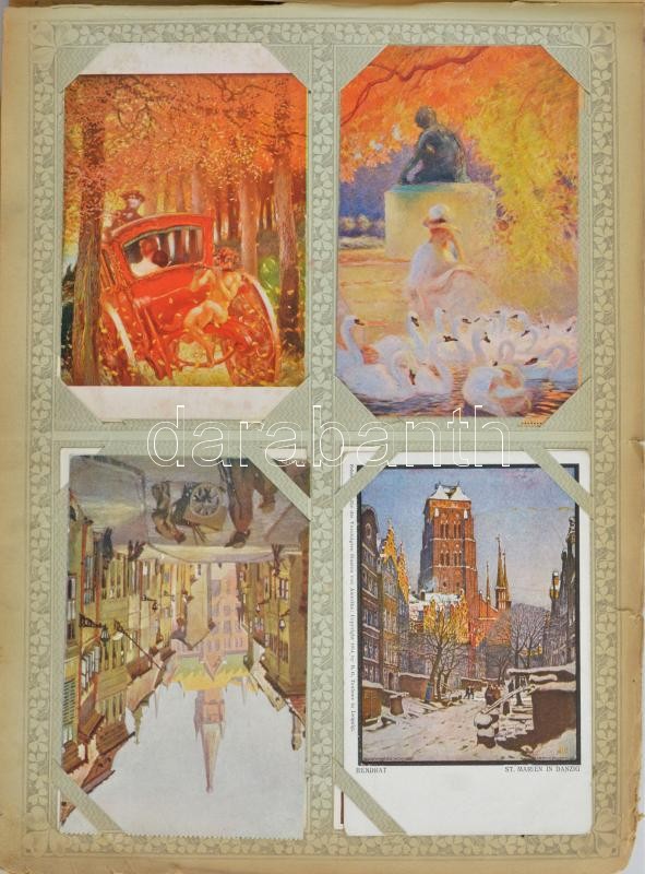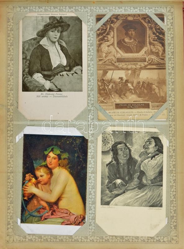 269 db RÉGI képeslap Haranghy Jenő gyűjteményéből szecessziós albumban (albumban sok szakadás): főleg művészeti lapok, sok aktfestmény, erotika, orosz festők és pár színész. Érdekes anyag / 269 pre-1945 motive postcards in Art Nouveau album (many tears in the album): mostly art and erotic postcards, actors, actresses, Russian painters