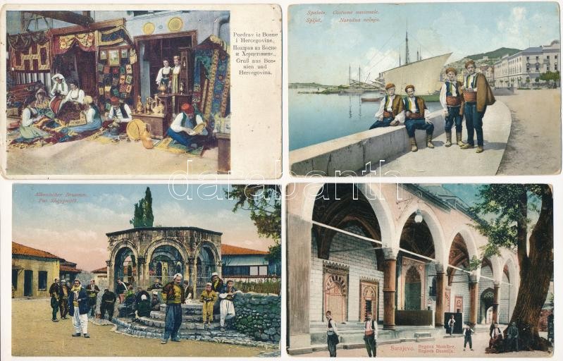 8 db RÉGI népviseletes motívum képeslap vegyes minőségben: Ada kaleh, bosnyák, albán, Sarajevo, Split / 8 pre-1945 folklore motive postcards in mixed quality: Ada Kaleh, Bosnia, Albania, Sarajevo, Spalato