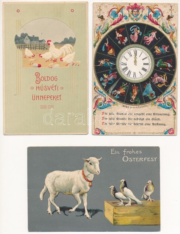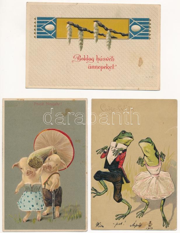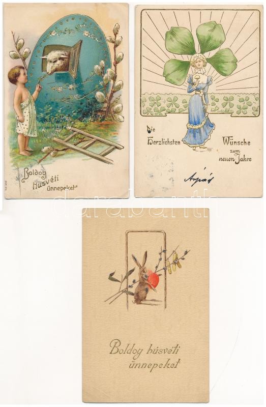 97 db RÉGI üdvözlő motívum képeslap albumban vegyes minőségben: karácsonyi, újévi, húsvéti, névnapi, szecessziós, dombornyomott és litho lapok / 97 pre-1945 greeting motive postcards in an album in mixed quality: Christmas, New Year, Easter, Name Day, many Art Nouveau, embossed and litho