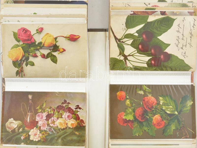 99 db RÉGI virágos üdvözlő és csendélet motívum képeslap albumban, több litho, vegyes minőség / 99 pre-1945 flower and still life greeting motive postcards in an album, mixed quality, many lithos