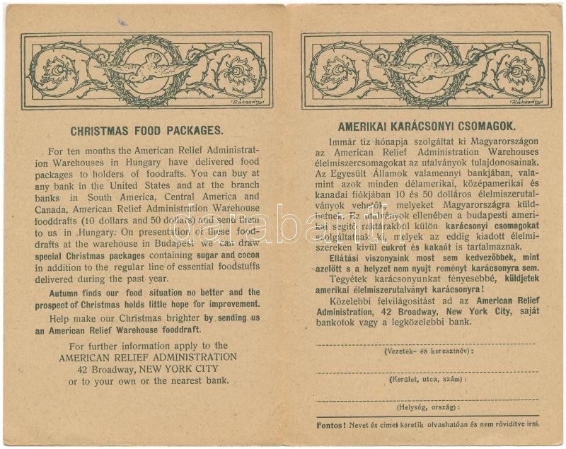Amerikai segítő raktárak. Kinyitható képeslap a karácsonyi csomagokról / American Relief Administration Warehouses, folding postcard with the Christmas food packages s: Rakssányi Dezső (fl)