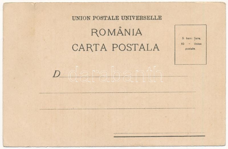 Romanul nu piere. Salutari din Romania Independenta - Szegedin, Colosvar, Vácz, Temesvár. Storck & Müller / Román függetlenségi propaganda / Romanian independence propaganda (kis szakadás / small tear)