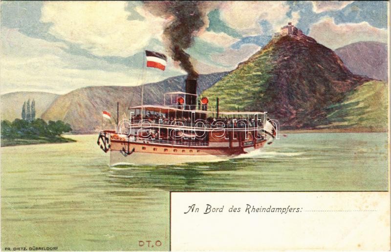 An Bord des Rheindampfers... Rhein-Dampfschiffahrt Kölnische und Düsseldorfer Gesellschaft / German steamship company, steamer line between Cologne and Düsseldorf, advertisement card (fl)