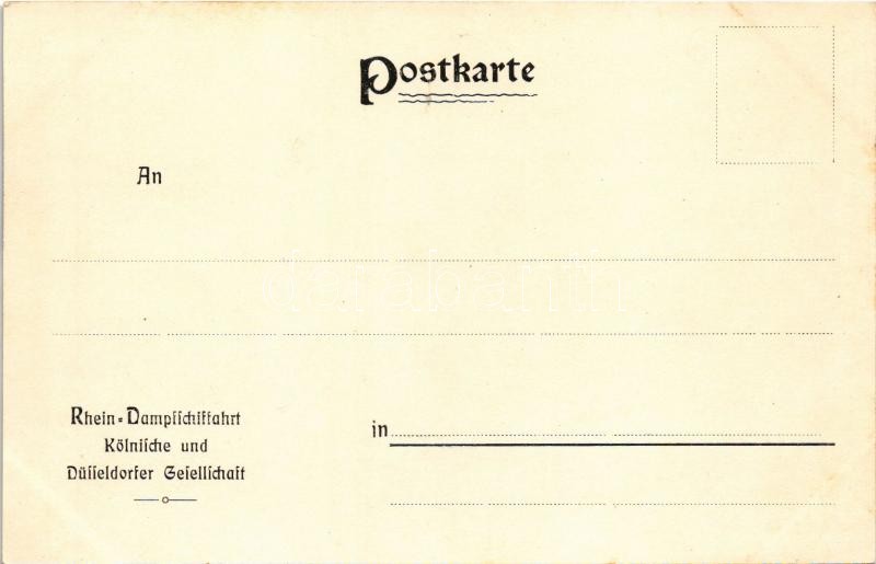 An Bord des Rheindampfers... Rhein-Dampfschiffahrt Kölnische und Düsseldorfer Gesellschaft / German steamship company, steamer line between Cologne and Düsseldorf, advertisement card