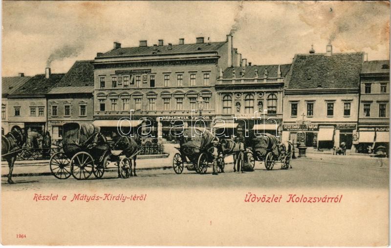 1906 Kolozsvár, Cluj; Mátyás király tér, lovaskocsik, Gergely Ferencz, Reményik Victor, Lászlóczki testvérek, Császár Dávid, Rácz János és Segesvári és társai üzlete, Duna biztosító / square, shops, insurance company (fl)