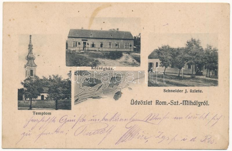 1912 Bégaszentmihály, Románszentmihály, Sanmihaiu Roman; Román ortodox templom, Községháza, Schneider J. üzlete. Kiadja Dajkovits J. utóda / Romanian Orthodox church, town hall, shop. Art Nouveau (EK)