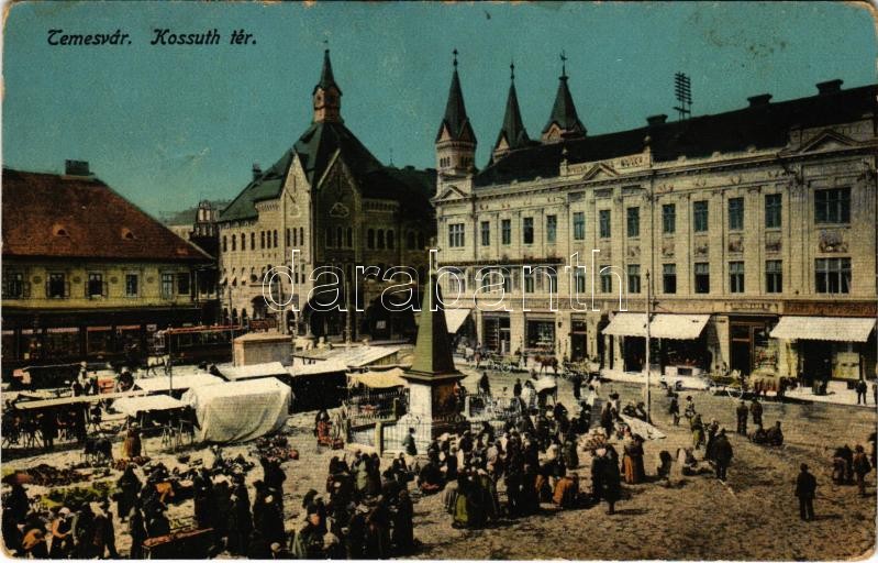 Temesvár, Timisoara; Kossuth Lajos tér, piac, Haring Gusztáv, Goldmann, Fülöp üzlete, villamos / square, market, shops, tram (b)
