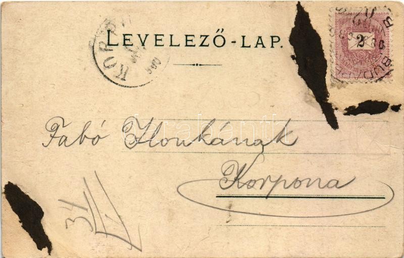 1900 Selmecbánya, Schemnitz, Banská Stiavnica; Leányvár, Szentháromság tér, Pacher-táró (Glanzenberg-altárna), Római Katolikus leányiskola és Ágostai Evangélikus templom, Beszállás előtt! katona. Joerges / castle, square, mine, Catholic girls school, Lutheran church, soldier. Art Nouveau, floral, litho (r)