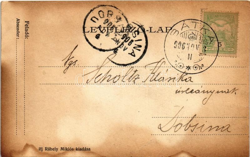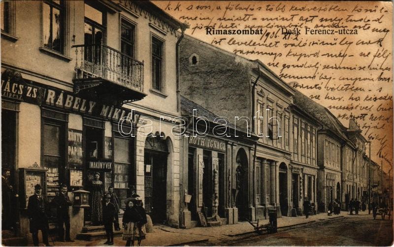 1906 Rimaszombat, Rimavská Sobota; Deák Ferenc utca, Rábely Miklós üzlete, Haas Salamon, Róth Ignác üzlete. Ifj. Rábely Miklós saját kiadása / street view, shops (fl)