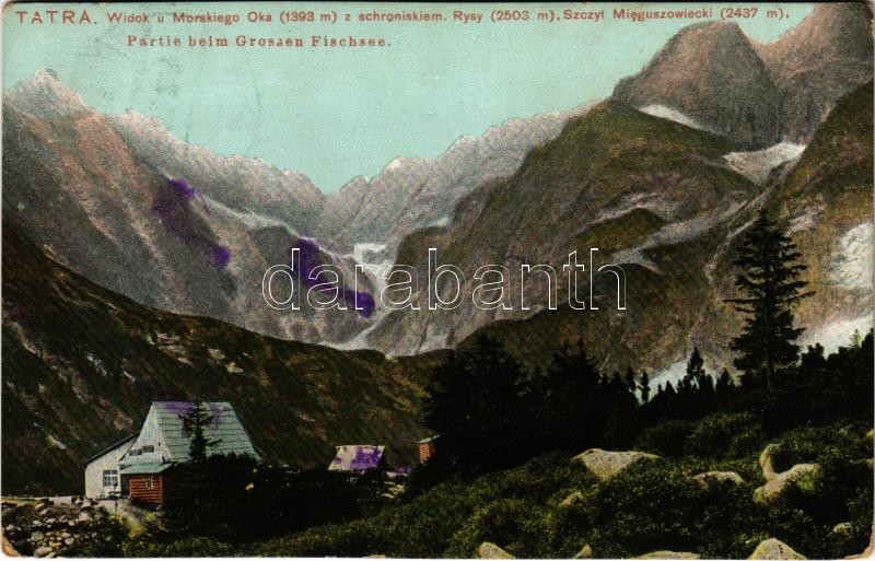 1908 Tátra, Magas-Tátra, Vysoké Tatry; Widok u Morskiego Oka z schroniskiem. Rysy, Szczyt Mieguszowiecki / Partie beim Grossen Fischsee / Részlet a Nagy Halastónál. Feitzinger Edw. No. 826. 1905. / lake, mountains, chalet (fl)