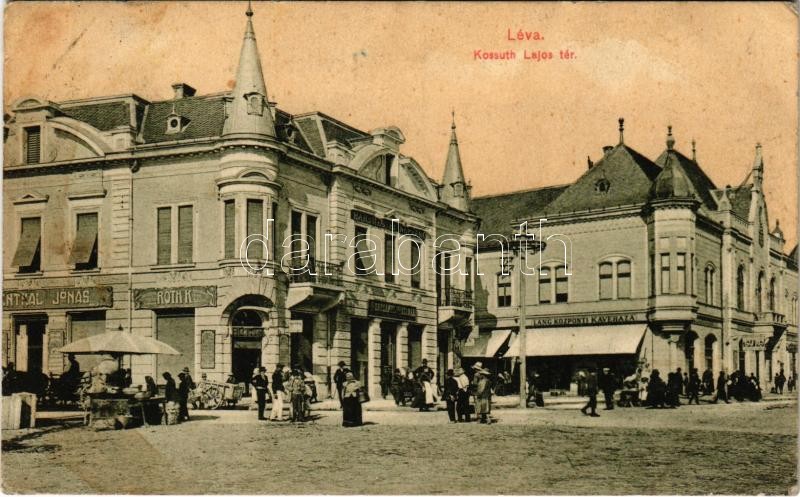 1913 Léva, Levice; Kossuth Lajos tér, Lang Központi Kávéháza, Barsmegyei népbank, Borcsányi és Csernák, Róth üzlete, piac / square, cafe, bank, shops, market (EK)