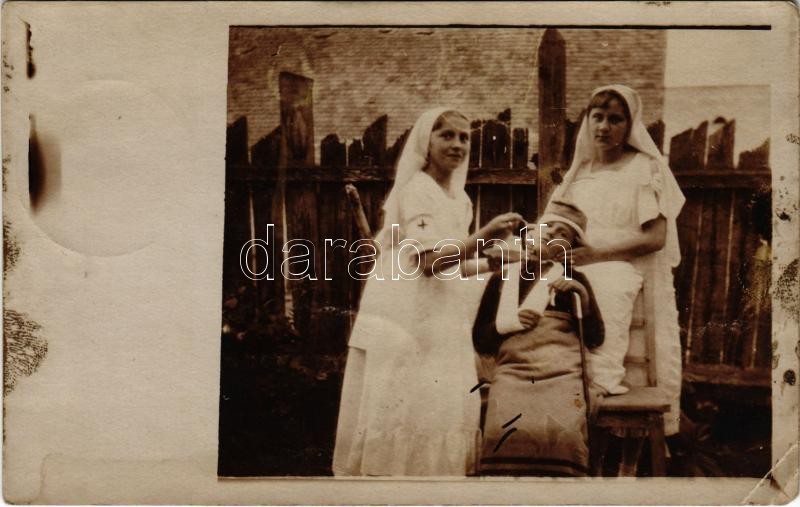 1915 Málnapatak, Málinec; vöröskeresztes ápolónőknek beöltözött lányok "sebesult katonával" / girls dressed as Red Cross nurses take care of the "injured soldier" boy. photo (EK)