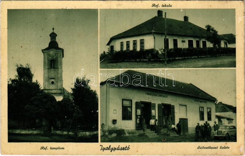1943 Ipolypásztó, Pásztó, Pastovce; Református templom és iskola, autó, Fogyasztási szövetkezet üzlete és saját kiadása / Calvinist church and school, automobile, cooperative shop
