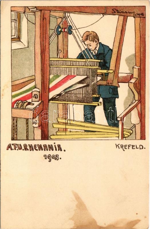 Beschreibung: Krefeld. A.F.U. Rhenania 1908 / German student fraternity. Studentica art postcard s: Stiasny (fl)