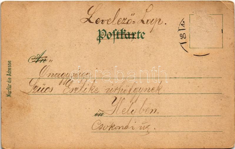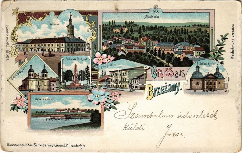 1900 Berezhany, Brzezany, Berezsani; Rathaus, Miasteczko, Griech. Kath. Kirche, Sobieski Denkmal, Kreisgericht, Schloss Kapelle, Schwimmschule / town hall, Greek Catholic church, monument, district court, castle chapel, swimming school. Kunstanstalt Karl Schwidernoch Art Nouveau, floral, litho (EK)