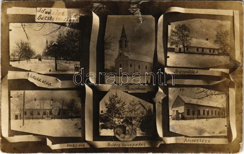 Bácskertes, Kupusina; Boldog Ünnepeket! Iskola utca, Templom, Jegyzőlak, Plébánia, Községháza télen / street view, church, notary, parish, town hall in the winter with Christmas and New Year greetings. photo (fl)