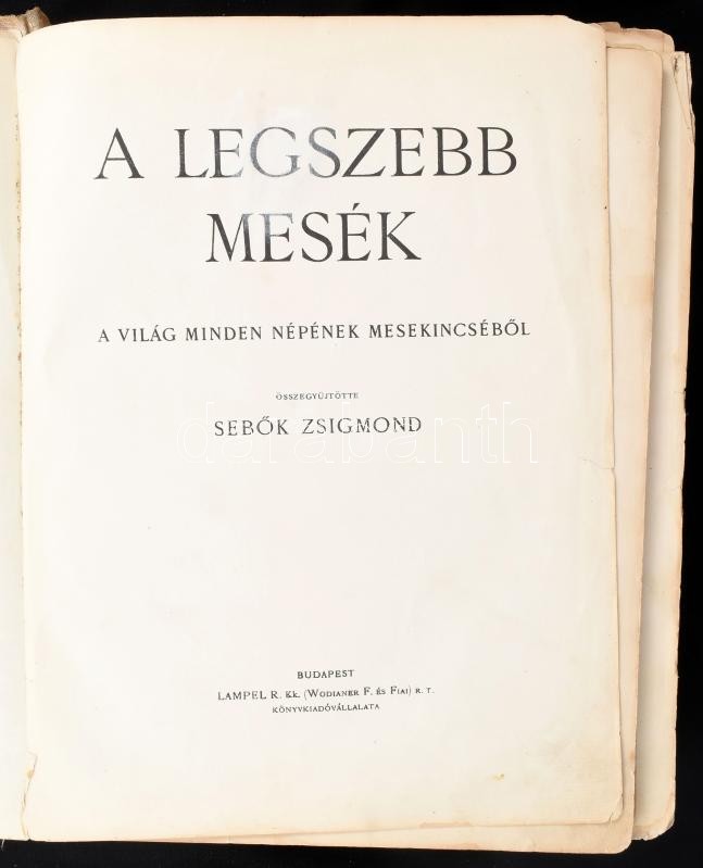A legszebb mesék a világ minden népének mesekincséből. Összegyűjtötte: Sebők Zsigmond. Bp., [1913], Lampel R. (Wodianer F. és Fiai). Egészoldalas, színes litográfiákkal illusztrálva. A borító Gara Arnold munkája. Kiadói egészvászon-kötés, viseltes állapotban, sérült, foltos borítóval, részben szétvált fűzéssel, a lapok egy része kijár.