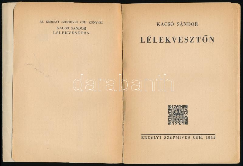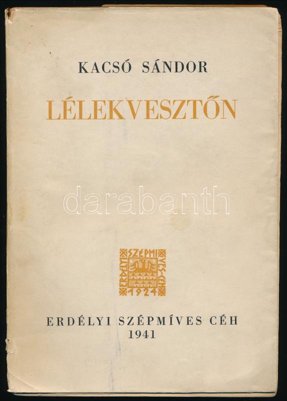 Kacsó Sándor: Lélekvesztőn. Az Erdélyi Szépmíves Céh 141. kiadványa, XII. sorozatának 15-16. számú könyve. Kolozsvár, 1941, Erdélyi Szépmíves Céh, 181+1 p. Kiadói papírkötés, szakadt borítóval.