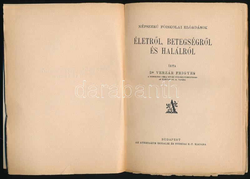 Verzár Frigyes: Életről, betegségről és halálról. Népszerű főiskolai előadások. Élet és Tudomány. Bp., [1925], Athenaeum, 231 p. Egyetlen kiadás. A borító illusztrációja Gara Arnold munkája. Kiadói papírkötés, helyenként kissé sérült lapszélekkel, nagyrészt felvágatlan lapokkal.