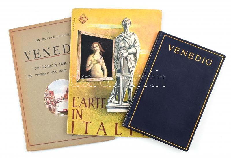 3 db Velence és Olaszország témájú kötet: Gustav Pauli: Venedig. Leipzig, 1926, E. A. Seemann. Fekete-fehér képekkel illusztrálva. Német nyelven. Aranyozott egészvászon-kötésben. + Venedig. Die Wunder Italiens. Seine Kirchen, Paläste und Kunstschätze. Florenz, 1931, G. Fattorusso. Gazdag fekete-fehér képanyaggal. Német nyelven. Kiadói illusztrált papírkötés. + L'Arte in Italia. Ente Nazionale per le Industrie Turistiche. Roma, 1942, ENIT. Fekete-fehér képekkel. Olasz nyelven. Kiadói illusztrált papírkötés, kissé sérült.