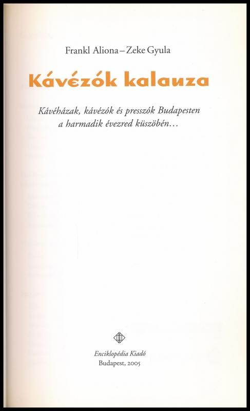 Frankl Aliona-Zeke Gyula: Kávézók kalauza. Kávéházak, kávézók és presszók Budapesten a harmadik évezred küszöbén. Bp., 2005., Enciklopédia Kiadó. Frankl Aliona fotóival illusztrált. Kiadói papírkötés.