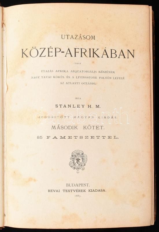 H. M. Stanley: Utazásom Közép-Afrikában vagy utazás Afrika Aequatoriális részének nagy tavai körül és a Livingstone folyón lefelé az Atlanti oceánig. II. kötet. Bp., 1883, Révai. Gazdag szövegközti és egészoldalas fametszetű képanyaggal, valamint egy kihajtható térképpel illusztrált.Korabeli kopottas félbőr kötésben, foltos lapokkal, szakadt térképpel.