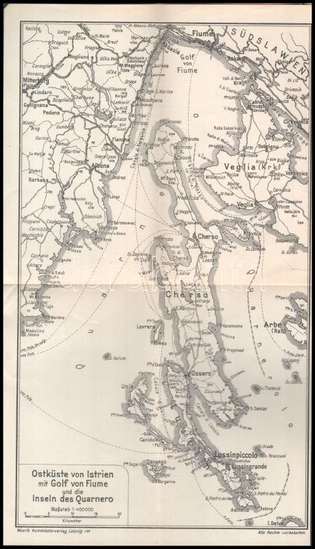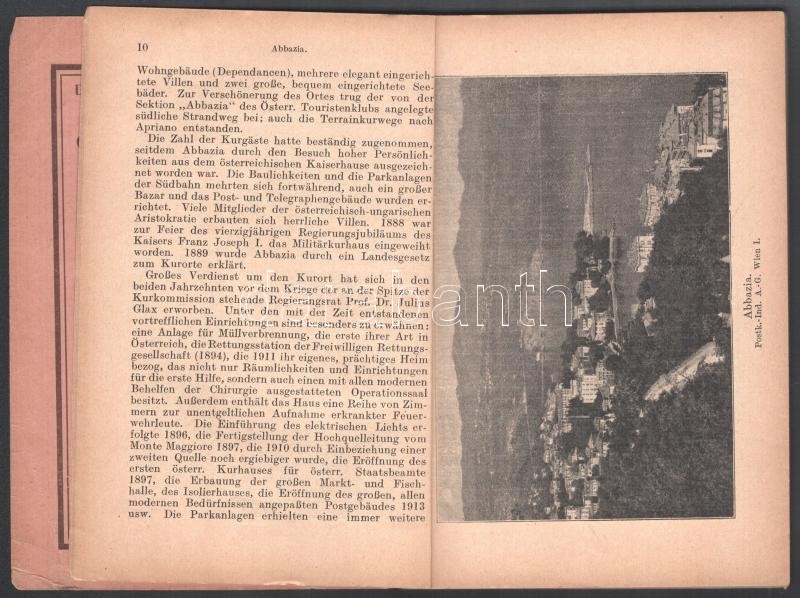 Illustrierter Führer von Abbazia, Fiume, Lussinpiccolo. Woerl's Reisehandbücher. Leipzig, én. (cca 1925), Woerl's Reisebücher, 109 p.+ 3 (kihajtható térképek, Ostküste von Istrien mit Golf Fiume, und die Inseln des Quarnero, Der Kurort Abbazia und seine nächste Umgebung, Fiume) t. VIII. Auflage. Egészoldalas és szövegközti fekete-fehér fotókkal illusztrált. Német nyelven. Kiadói papírkötés, jó állapotban.