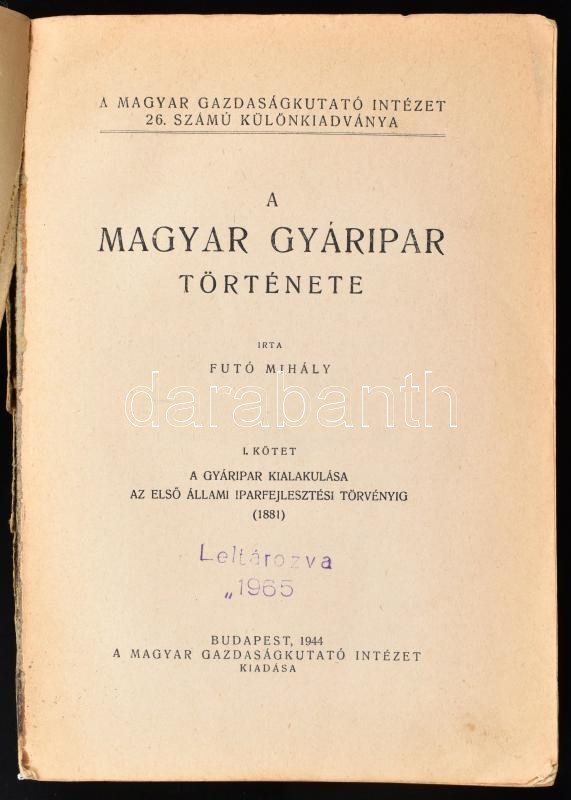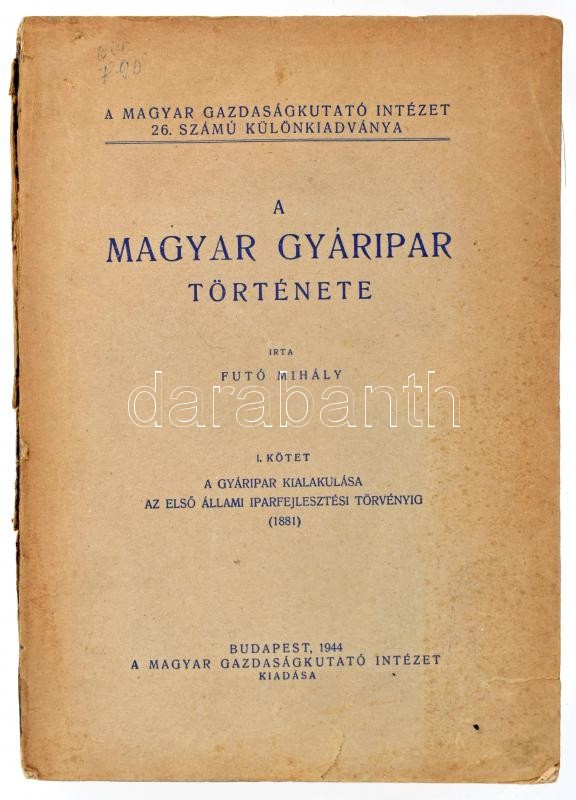 1944 Futó Mihály: A magyar gyáripar története I. A Magyar Gazdaságkutató Intézet. Kiadói papírkötésben, szakadt borító és gerinc, aláhúzásokkal. Volt könyvtári példány, könyvtári pecséttel.
