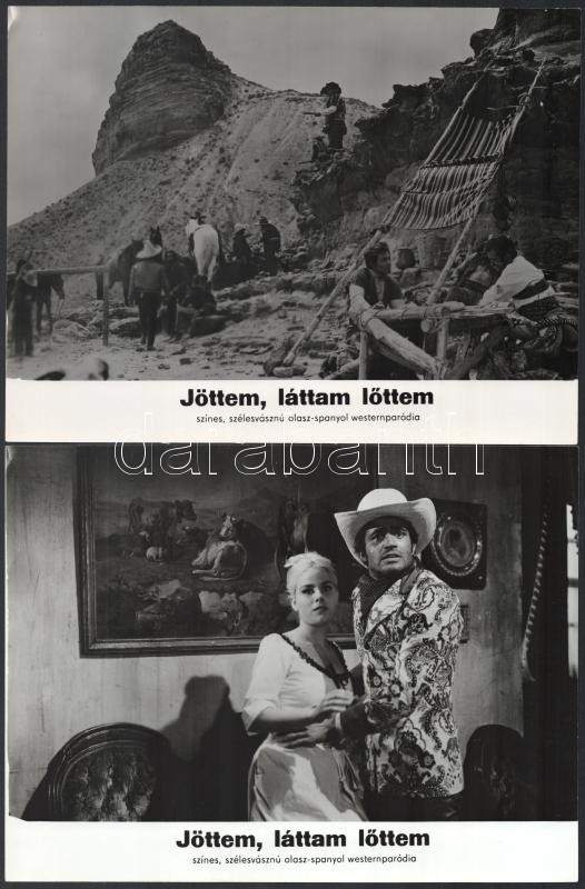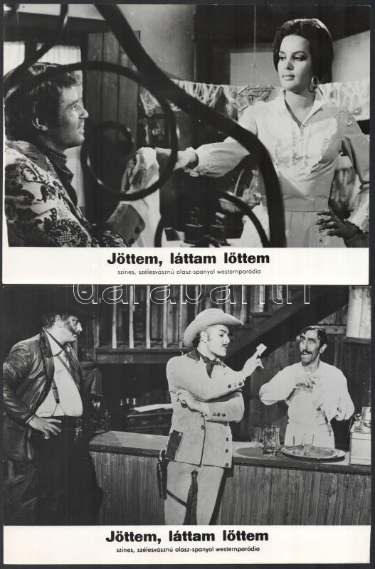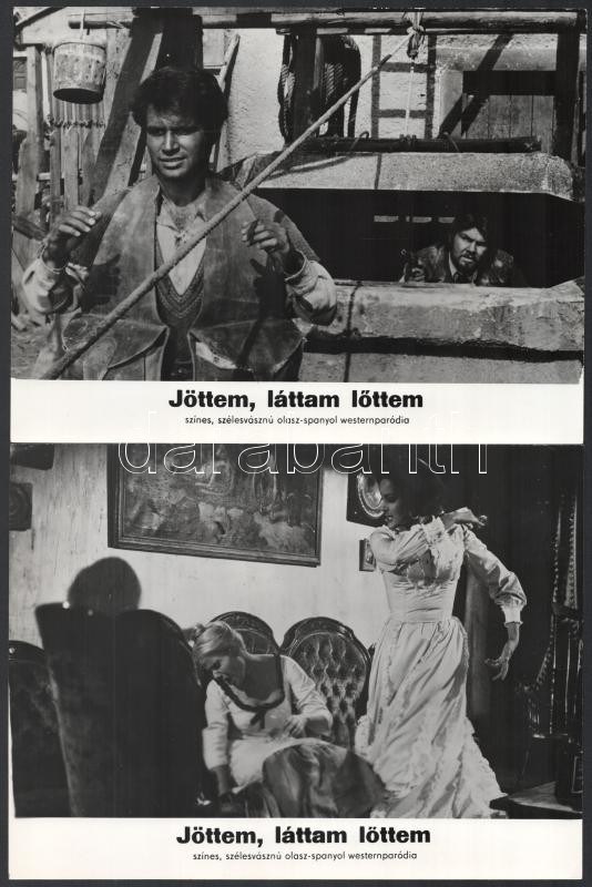 1968 ,,Jöttem, láttam, lőttem" című olasz - spanyol westernparódia jelenetei és szereplői, 13 db vintage produkciós filmfotó, ezüst zselatinos fotópapíron, kisebb - a használatból eredő - hibákkal,18x24 cm