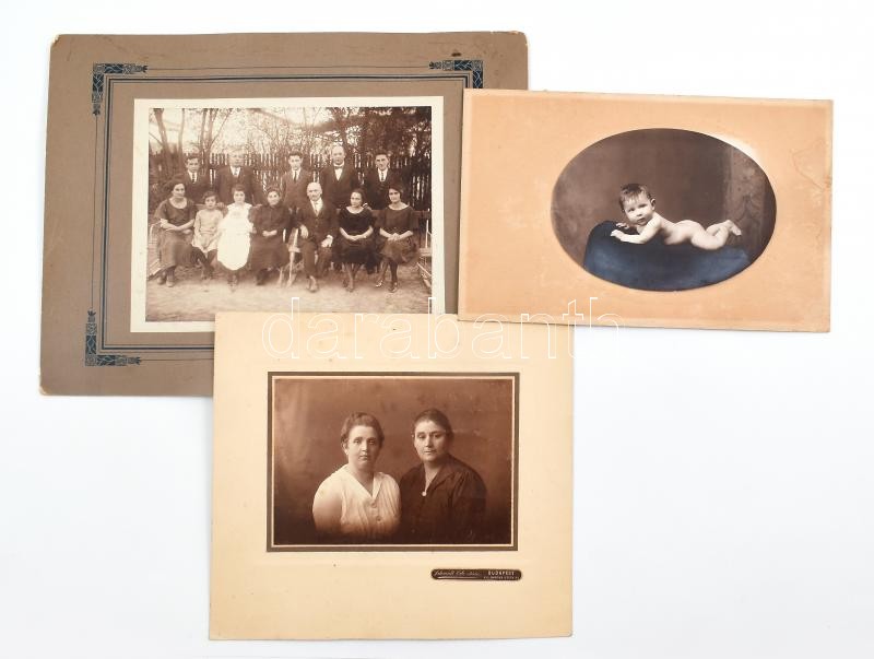 cca 1910-1920 3 db kartonra kasírozott régi fotó, közte egy Schmidt Ede utóda budapesti, ill. egy Prohászka János kisvárdai műterméből, 15x11 cm és 21x16 cm között
