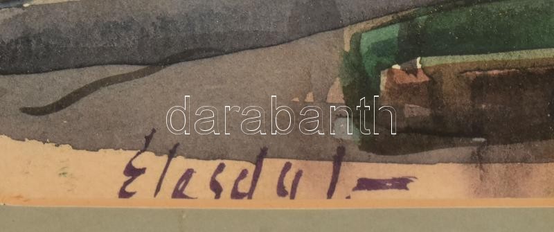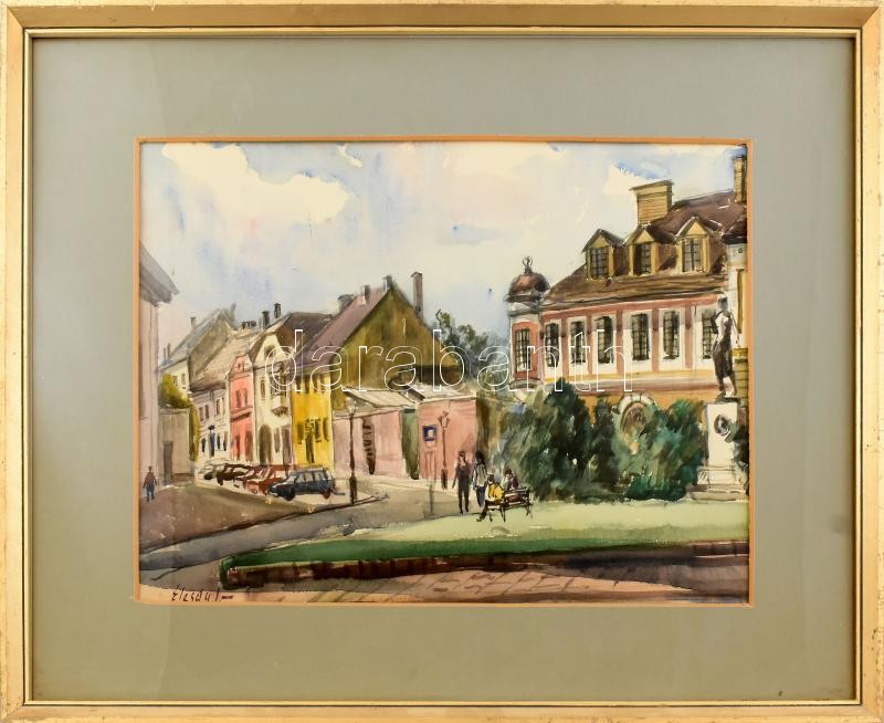 Élesdy István (1912-1987): Bécsi kapu tér, Fortuna utca. Akvarell, papír, jelzett. Kiállítva: Csontváry terem, Bp., 1982, egyéni kiállítás. Hátoldalán Képcsarnok Vállalat címkéjével, üvegezett fakeretben. 33,5x47 cm