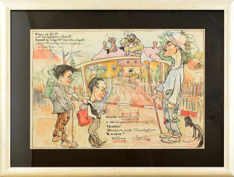 Beschreibung: Pólya T jelzéssel: Misa az éjiőr (...). Vegyes technika, papír, 29×41 cm. Üvegezett fakeretben.