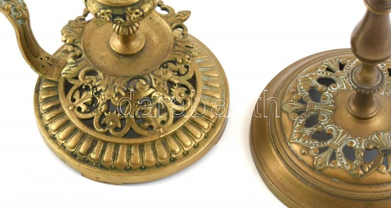 Beschreibung: 2 db régi bronz gyertyatartó, egyik sétáló, m: 11 és 20 cm