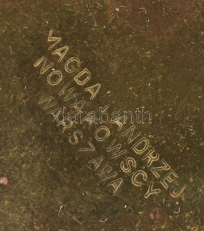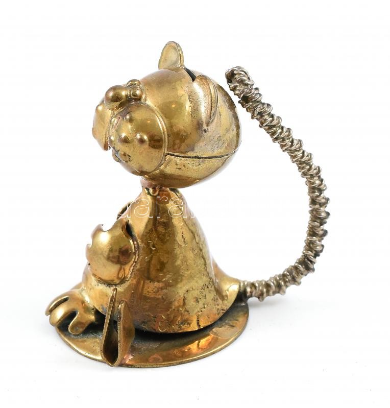 Mid-Century Figurative Art by Magda és Andrzej Nowakowscy (1938 - 2008): Egér / Mysz, névjegy tartó, örvösművészeti réz. Jelzett: Magda i Andreze Nowakowscy. m:4,5cm, h:4cm. Andrzej Jerzy Nowakowski Warszawa / Varsó. 1938. október 2-án született Lublinban. Miután Varsóba költözött, ahol befejezte az általános iskolát. Még annak befejezése előtt sikeres felvételi vizsgát tett a varsói Állami Képzőművészeti Középiskolába, ahol négy évig (1953-1957) tanult, és nagyon jó jegyeket kapott művészeti tárgyakból - rajz, festészet, szobrászat -. Az 1957-1966-os években kizárólag a művészeti munkának szentelte magát - akvarelleket és olajfestményeket festett, valamint vázlatokat és karikatúrákat rajzolt. Ebben az időszakban "fedezte fel" a művészi fémművességet, amely szerelme és szenvedélye lett, amely egész életében kitartott. Először fémből készítette első munkáit: ékszereket (karkötőket, gyűrűket, brossokat és nyakláncokat), és - ami egész életművének védjegyévé vált - egyedi figurákat. / Andrzej Jerzy Nowakowski urodził się 2 października 1938 roku w Lublinie. Po przeprowadzeniu się do Warszawy, gdzie ukończył szkołę podstawową. Jeszcze przed jej ukończeniem zdał egzamin wstępny do Państwowego Liceum Sztuk Plastycznych w Warszawie, gdzie uczył się cztery lata (1953-1957), mając bardzo wysokie oceny z przedmiotów artystycznych - rysunek, malarstwo, rzeźba. W latach 1957-1966 poświęcił się wyłącznie twórczości artystycznej - malował akwarele i obrazy olejne oraz rysował szkice i komiksy. W tym okresie ,,odkrył" metaloplastykę artystyczną, która stała się jego miłością i pasją trwającą do końca życia. Najpierw tworzył pierwsze dzieła w metalu: biżuterię (bransolety, pierścionki, broszki i naszyjniki) oraz, co stało się znakiem rozpoznawczym Jego całej twórczości - niepowtarzalne figurki.