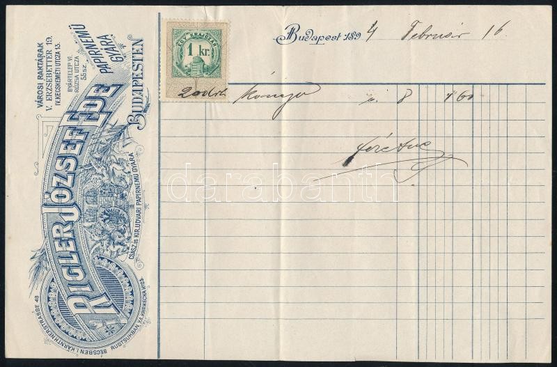 1894 Bp., Rigler József Ede cs. és kir. udvari papírneműgyár fejléces ... https://www.darabanth.com/de/420-Fernauktion/420.0/Kunst-Dokumente-andere-Sammelgebiete/Dokument~500018/1894-Bp-Rigler-Jozsef-Ede-cs-es-kir-udvari-papirnemugyar-fejleces-szamla-okmanybelyegg~II2629066