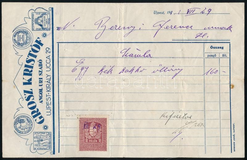 1931 Újpest, Grosz Kristóf angol úri szabó fejléces számlája, 2f okmán... https://www.darabanth.com/de/420-Fernauktion/420.0/Kunst-Dokumente-andere-Sammelgebiete/Dokument~500018/1931-Ujpest-Grosz-Kristof-angol-uri-szabo-fejleces-szamlaja-2f-okmanybelyeggel~II2660821