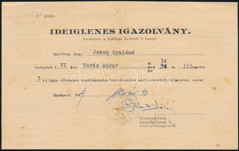 1944 Bp., ideiglenes igazolvány repülőtámadás következtében kárt szenv... https://www.darabanth.com/de/420-Fernauktion/420.0/Kunst-Dokumente-andere-Sammelgebiete/Dokument~500018/1944-Bp-ideiglenes-igazolvany-repulotamadas-kovetkezteben-kart-szenvedett-elelmezesre-s~II2654610