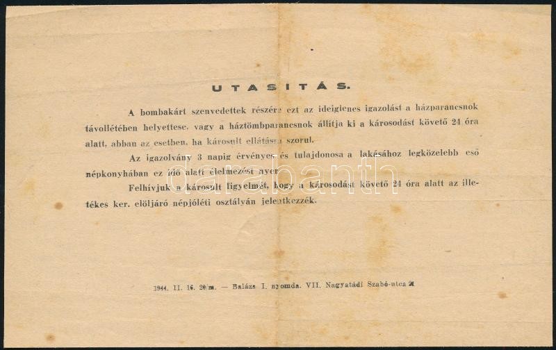Beschreibung: 1944 Bp., ideiglenes igazolvány repülőtámadás következtében kárt szenvedett, élelmezésre szoruló személy számára, kissé foltos
