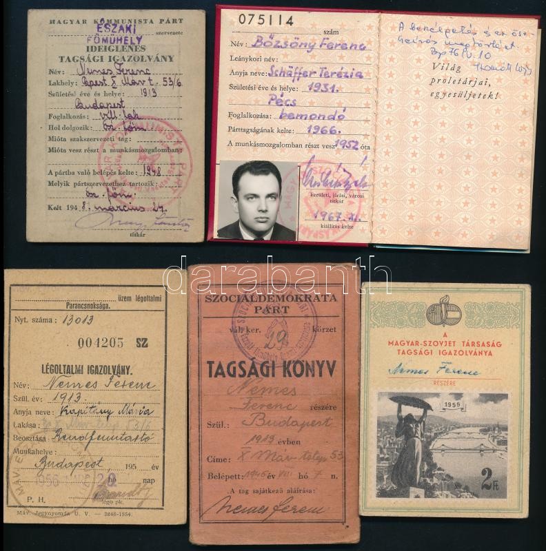 8 db vegyes igazolvány (Magyar-Szovjet Társaság, MSZMP, SZDP, MKP tags... https://www.darabanth.com/de/420-Fernauktion/420.0/Kunst-Dokumente-andere-Sammelgebiete/Dokument~500018/8-db-vegyes-igazolvany-Magyar-Szovjet-Tarsasag-MSZMP-SZDP-MKP-tagsagi-igazolvany-legoltal~II2657397