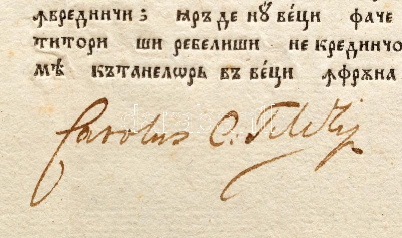 cca 1780-1800 Régi cirill-betűs román nyelvű okirat, nyomtatott, autográf aláírásokkal, közte: Carolus C. Teleky (Teleki Károly (?-?) erdélyi kincstárnok (1783-tól), hajtott, 36x39 cm / cca 1780-1800 Old document in Romanian language, with cyrillic alphabets, with 3 autograph signatures, one of them: Carolus C. Teleky (Károly Teleky (?-?) Transylvanian treasurer (from 1783), folded, 36x39 cm