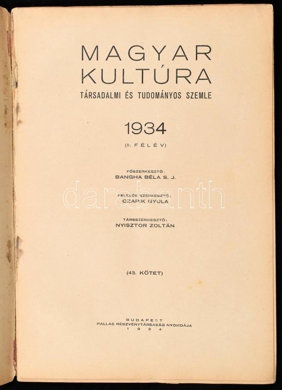 1934 Magyar Kultúra társadalmi és tudományos folyóirat 12 db száma, XXI. évf. 13-24. sz. (II. fél évfolyam), 1934. júl. 5. - dec. 20., szerk.: Bangha Béla. Vegyes állapotban, helyenként sérült, foltos.