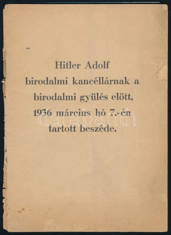 1936 Hitler Adolf beszéde a birodalmi gyűlés előtt 1936 március hó 7-é... https://www.darabanth.com/de/420-Fernauktion/420.0/Kunst-Dokumente-andere-Sammelgebiete/Drucksachen~1500002/1936-Hitler-Adolf-beszede-a-birodalmi-gyules-elott-1936-marcius-ho-7-en-hatso-boritoja-e~II2654576