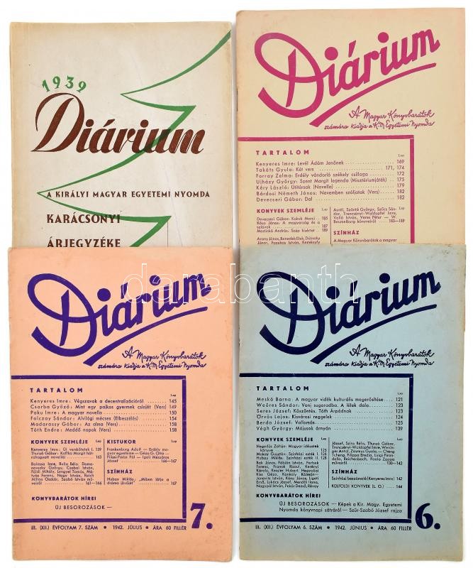 1939-1942 Diárium III. (XII.) évfolyamának 3 db száma (6., 7., 8. sz.) + Diárium karácsonyi árjegyzéke a Magyar Könyvbarátok számára. Bp., Kir. M. Egyetemi Nyomda. Papírkötésben, vegyes állapotban.