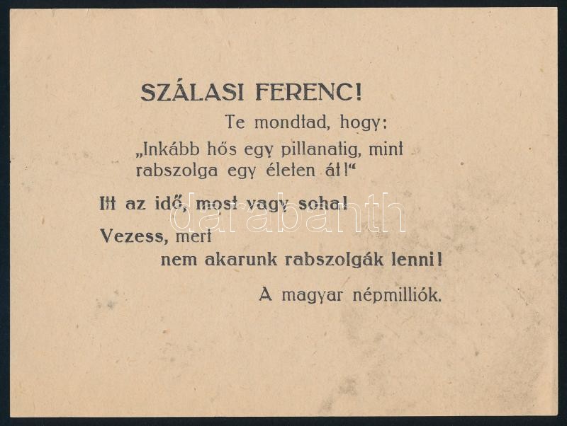 cca 1944 Szálasi Ferenc! Vezess, mert nem akarunk rabszolgák lenni! - ... https://www.darabanth.com/de/420-Fernauktion/420.0/Kunst-Dokumente-andere-Sammelgebiete/Drucksachen~1500002/cca-1944-Szalasi-Ferenc-Vezess-mert-nem-akarunk-rabszolgak-lenni-roplap-13C39717-cm~II2656598