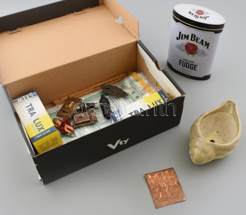 Beschreibung: Egy doboznyi vegyes bolha tétel, benne csigaház formájú kerámia, Jim Beam fémdoboz, mini baba, stb.