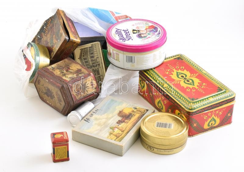 Beschreibung: Egy zacskónyi vegyes fém doboz: süteményes, teás, kekszes, stb