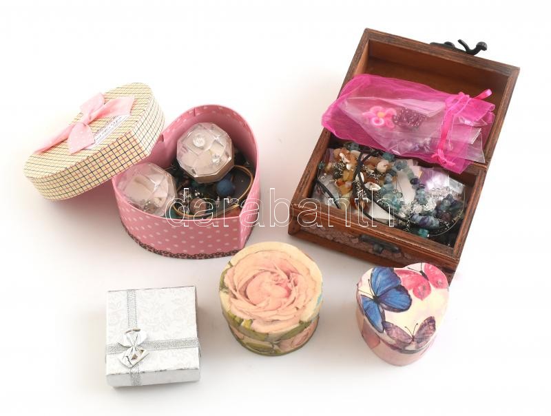 Beschreibung: Vegyes ékszertartó doboz tétel, 5 db, benne bizsu ékszerekkel és ékszerszerelékekkel