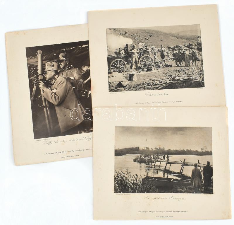 cca 1914-1918 Az Érdekes Újság 3 db háborús képe (Szükséghíd verése a Dunajecen, Élet a táborban, Hadffy tábornok a csata menetét figyeli). A Légrády Testvérek kiadása (Az Országos Magyar Hadimúzeum Egyesület kizárólagos terjesztése). Fénynyomat, papír, vegyes állapotban, 27x20 cm