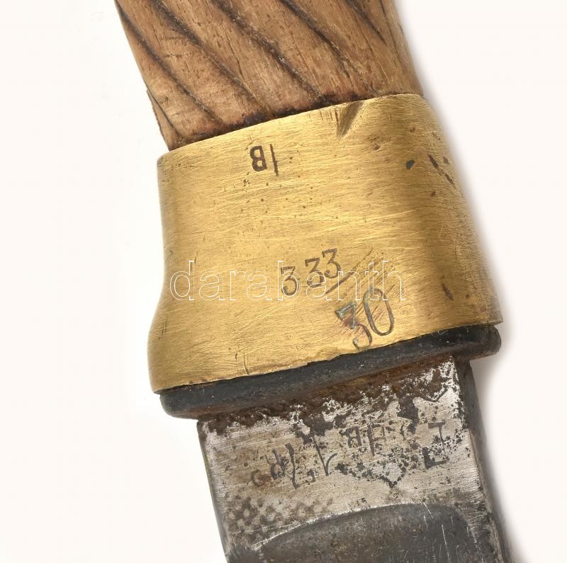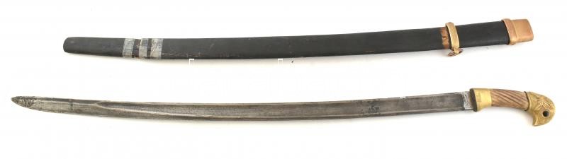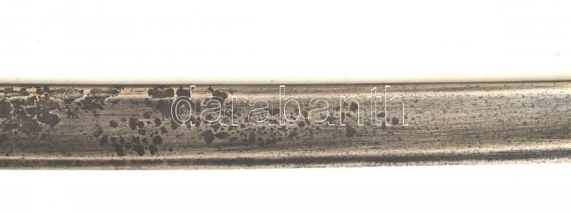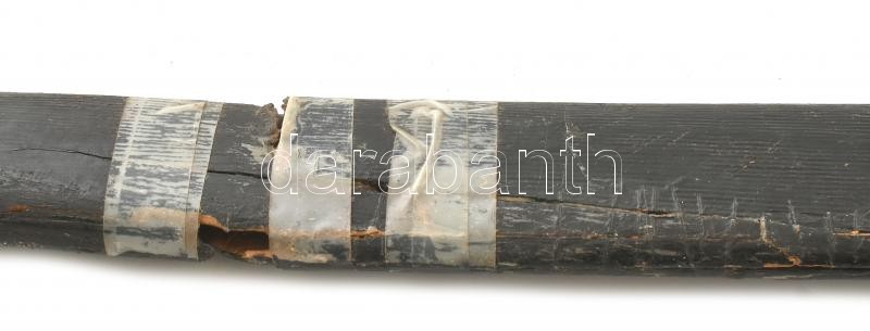 cca 1929 Szovjet kozák saska, a markolaton stilizált szovjet címerrel, jelzett, kis csorbákkal, a felületén sérülésnyomokkal, a markolatfej kissé laza, a tok sérült, javított, pengehossz: 80 cm, teljes kardhossz: 93,5 cm, tok hossz: 84 cm