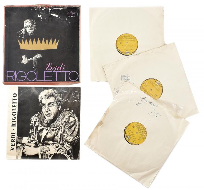 1966 Verdi: Rigoletto díszelőadásra kiadott lemez és műsorfüzet szövegkönyve, benne az énekesek aláírásával, László Margit, Nádas Tibor, Lévai, Kishegyi Árpád, kissé foltos